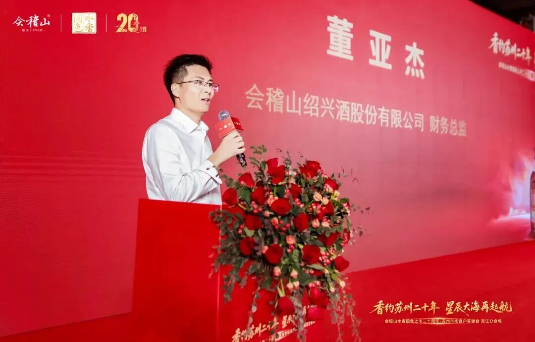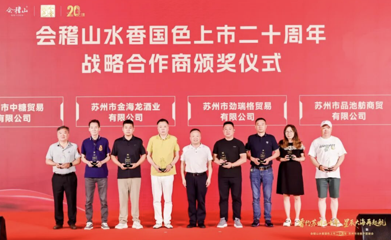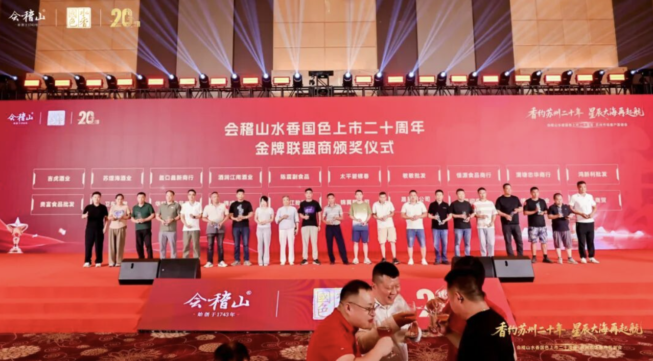 秋光澄澈,酒香氤氲。9月17日,“香约苏州二十年·星辰大海再起航”——会稽山水香国色上市二十周年暨江苏市场客户答谢会在苏州和吴江隆重举行。会稽山绍兴酒股份有限公司(以下简称“会稽山”)党委书记、副董事长傅祖康,会稽山财务总监董亚杰,会稽山品牌市场部总监牛小卡,会稽山事业部常务副总经理杨坤,会稽山事业部营销管理部总监魏朝阳,会稽山事业部苏州战区总监段晓鹏等企业领导与来自江苏各地的数百名经销商伙伴齐聚一堂,共品廿载携手酿造的醇厚情谊,共启市场新程的壮阔蓝图。