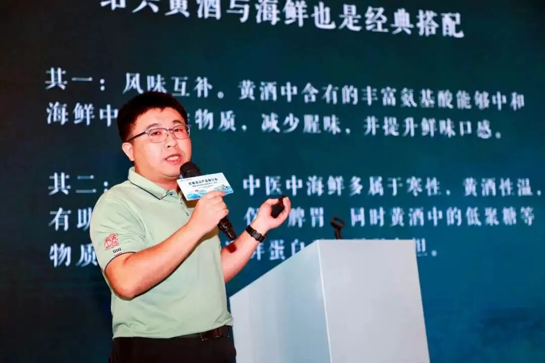 古越龙山市场营销部部长阮帅作产品主题推介,他从“为什么选择绍兴黄酒?”“为什么选择古越龙山?”以及“如何选择合适产品?”三个维度,系统阐述了绍兴黄酒的独特价值、古越龙山的龙头地位及产品矩阵策略。阮帅指出,绍兴黄酒得天独厚,其温润特性与健康属性,尤其适合搭配青岛海鲜,能够中和海鲜寒性,提鲜增味,可谓“吃海鲜,喝黄酒,更长寿”。针对不同消费需求,阮帅重点推介了只此青玉、青花醉十二年、天纯、绍兴老酒四款产品,这四款产品涵盖了从高端收藏、宴请馈赠到日常饮用、入门体验的全场景需求,能够满足不同消费者的多样化选择。