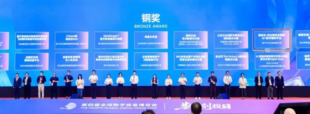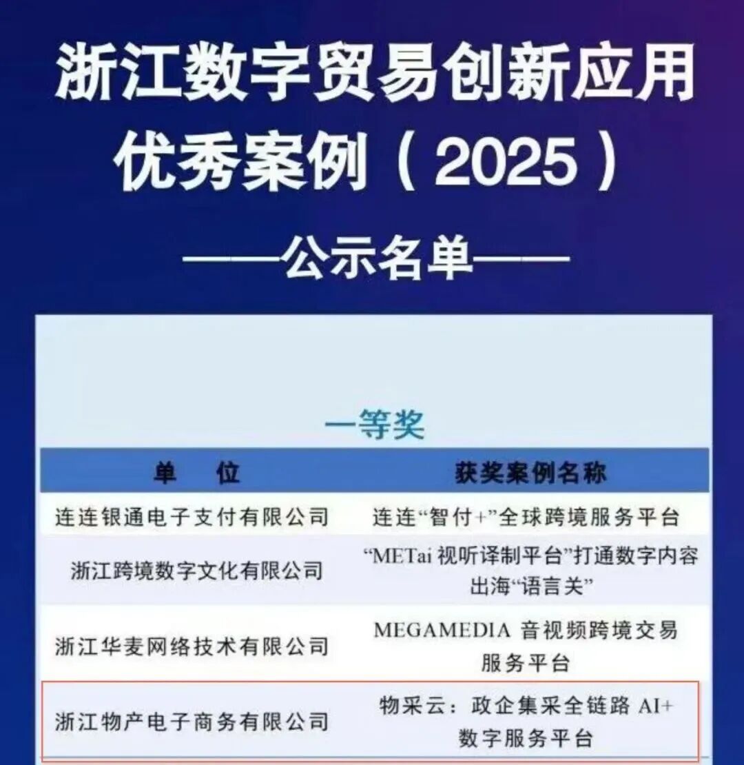 物产中大云商旗下物产电商公司《物采云:政企集采全链路AI+数字服务》斩获DT奖铜奖、浙江数字贸易创新应用优秀案例一等奖,入选《数字贸易发展合作案例集》。