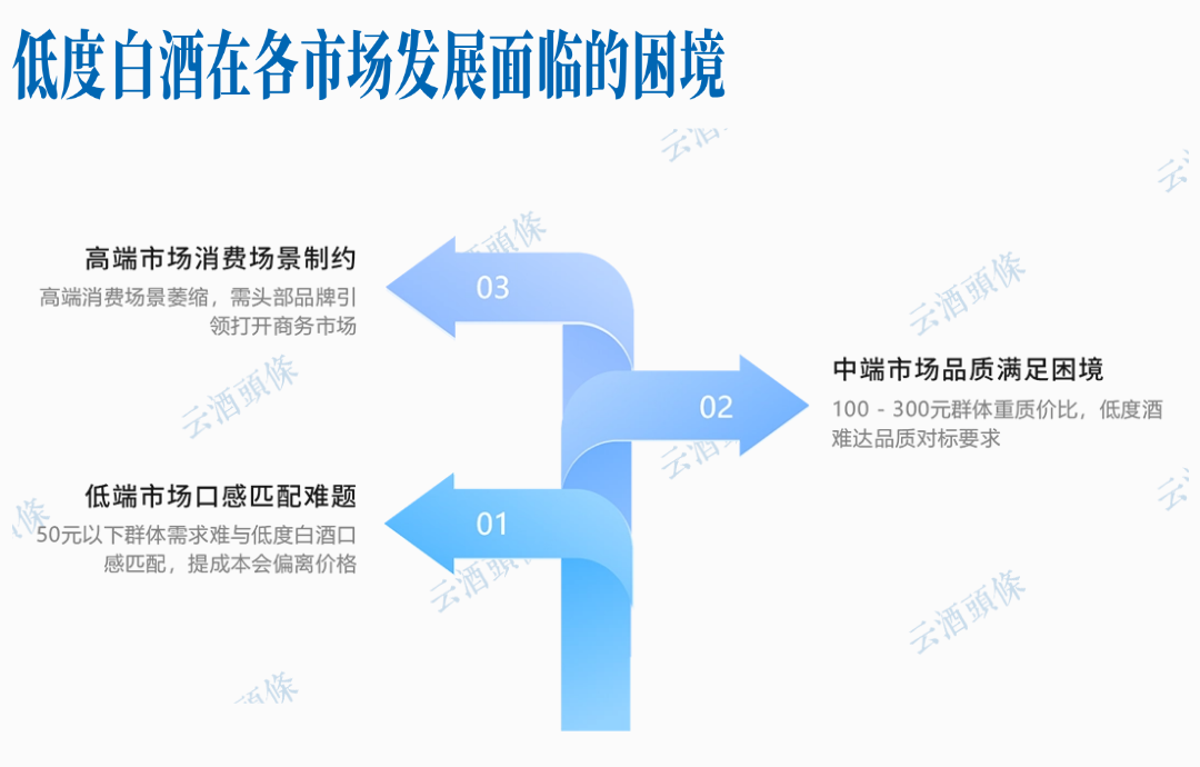 所谓双低就是低质产品、低端市场。看历史,山东胶东半岛地区出现过这种双低白酒,但几十年了也没把市场做起来。其原因除了胶东半岛酒类消费以啤酒为主外,低质造成的口感不适和低端造成的价格太低问题,严重制约了低度酒的消费价值提升和企业的市场投入能力。