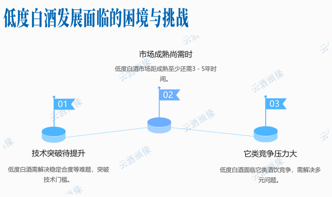 对于长期以高度酒为价值标杆和市场主导的传统白酒来说,低度酒的认知教育、产品价值的提升、品牌阵营的形成等还需要行业投入较大的精力。因此低度白酒距离市场成熟至少还需要3-5年的路要走。.