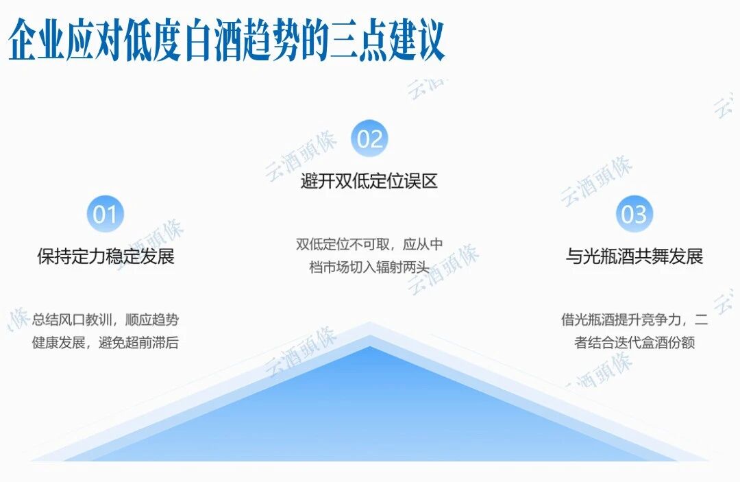 因此,在高端市场,可通过光瓶低度酒形式提升质价比竞争力。在中端市场,可通过光瓶低度酒的舒适度优势占据中产社交和大众喜宴市场。在低端市场,可凭借舒适度优势满足大众畅饮需求。