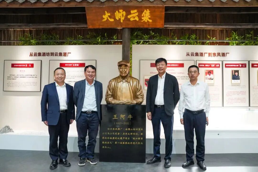 ▌钱院士(左二)与东风酒厂原党支部书记、绍酒泰斗王阿牛大师铜像合影