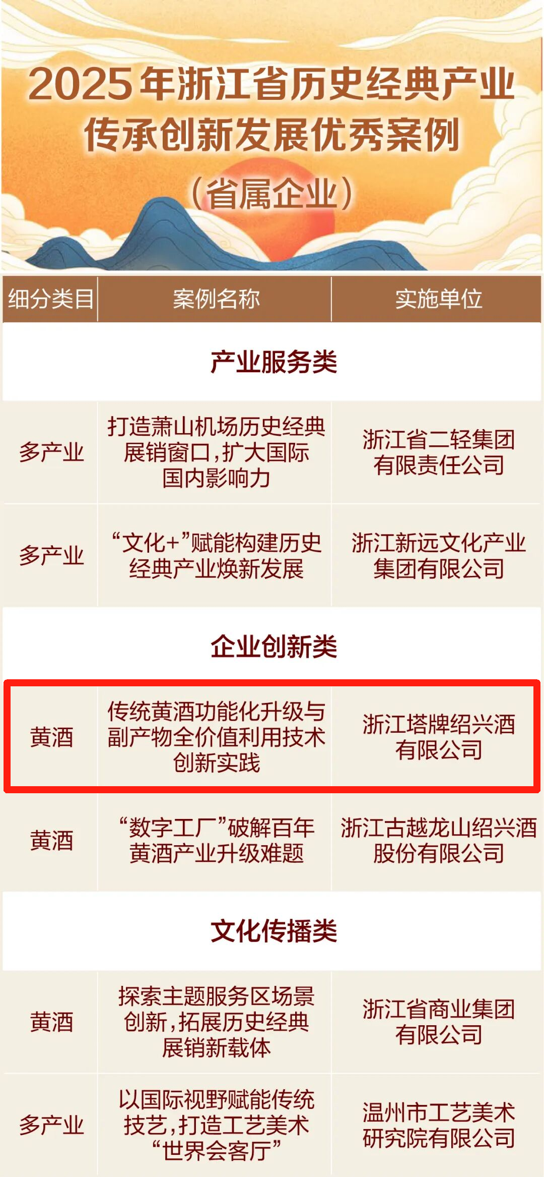近日,浙江公布了省历史经典产业传承创新发展优秀案例名单,全省共40个案例入选,其中国企领域有6例入选。浙江塔牌绍兴酒有限公司凭借传统黄酒功能化升级与副产物全价值利用技术创新实践成功入选,为企业创新类优秀案例代表之一。