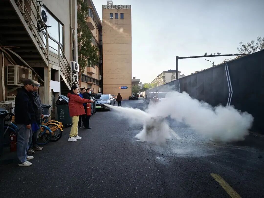 本次活动面向聚落五号的租户企业展开,共邀请了十余家企业参与其中。企业代表们投身于一场“沉浸式”消防培训活动。在理论授课环节,来自杭州应急培训管理中心的专业教师,围绕消防安全责任制、火灾隐患排查的关键要点、电器设备的规范使用准则、初期火灾的有效扑救方法以及应急疏散的具体流程等核心内容,结合各企业实际场景中的典型案例,进行了全面且细致的讲解,确保企业代表们能够深入理解并掌握相关消防知识。