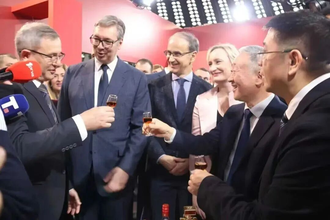 开幕式当天,塞尔维亚总统武契奇在致辞后,与塞尔维亚总理久罗·马楚特等亲临中国酒展区,宋书玉理事长向武契奇总统、马楚特总理、张喆代办、鲍顺青参赞、郭云姗副处长以及众多外宾介绍了中国酒产品和中国酒文化,特别推介了古越龙山高端产品——“只此青玉”,并邀请总统品鉴。武契奇总统对“只此青玉”赞誉有加,充分肯定其独特风味与文化内涵,这一时刻不仅成为中国黄酒走向国际的高光时刻,也是中塞两国在“一带一路”框架下深化文化交流的鲜活例证。来自欧洲的酒类经销商、买家及专业观众也纷纷品鉴“只此青玉”,在中国酒展区与代表团热情交流。