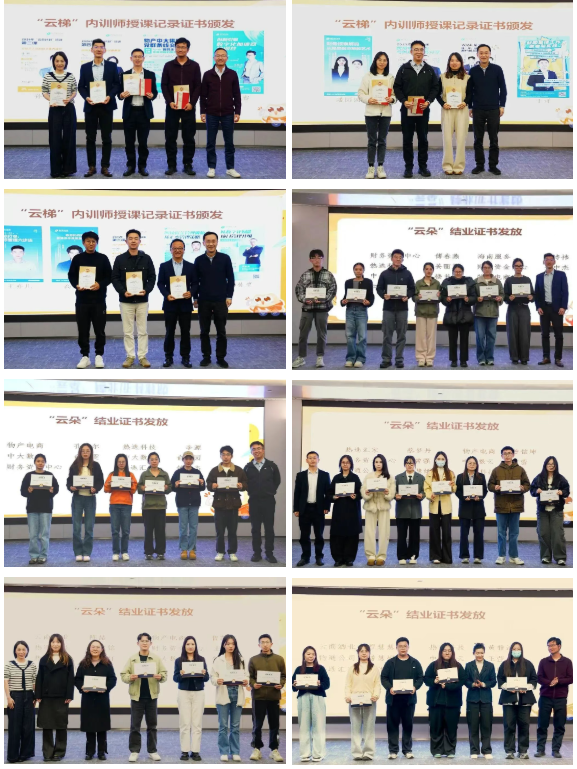 仪式尾声,内训师代表为“云朵计划”全体学员颁发结业证书,物产中大云商领导分别为内训师授予授课记录证书、为优秀学员颁发荣誉证书,以此表彰他们在培训期间的突出表现与辛勤付出。