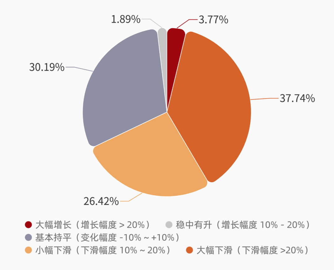 有超60%的经销商预计今年营收将低于2024年,其中,更有近40%的经销商表示下滑幅度会超过20%;有约30%的受访者表示营收较去年基本持平,变化幅度在-10%~+10%之间;仅有约5%的受访者认为今年营收增幅将超过10%。