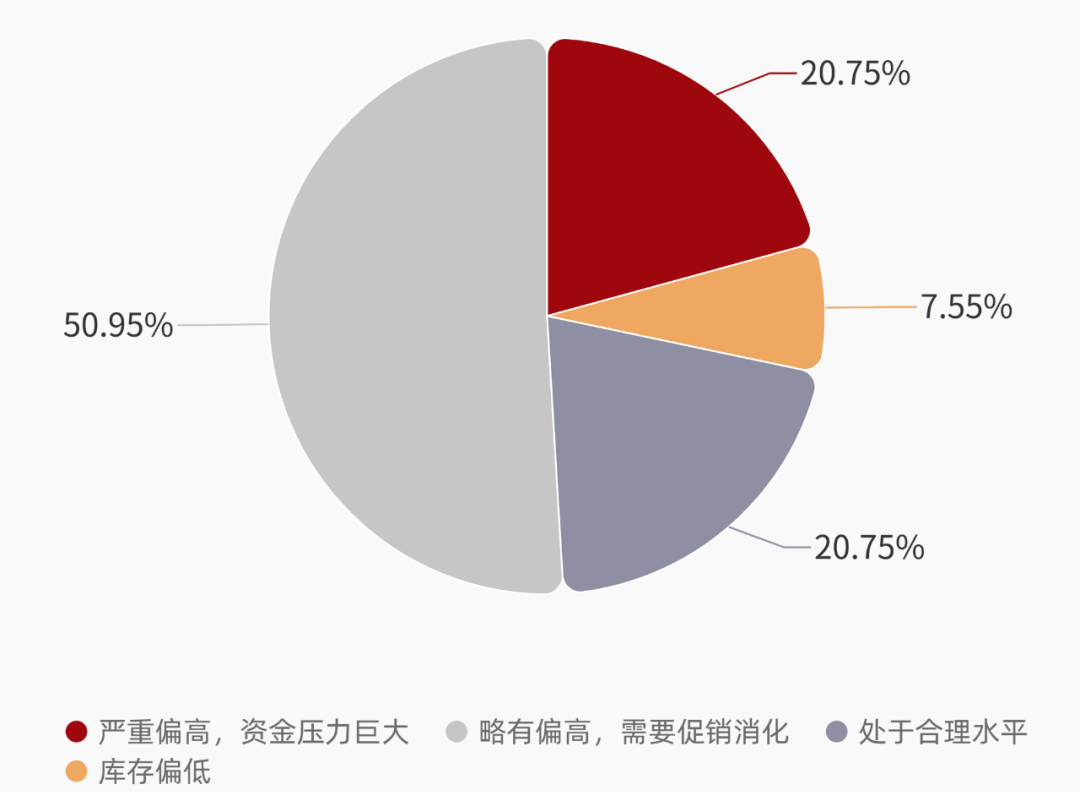 然而,从目前调研结果来看,仍有超七成的经销商表示当前库存仍是居高状态。其中,有超20%的受访者称当前库存“严重偏高,资金压力巨大”,超一半的经销商表示库存略高,仍需要通过促销进行消化。