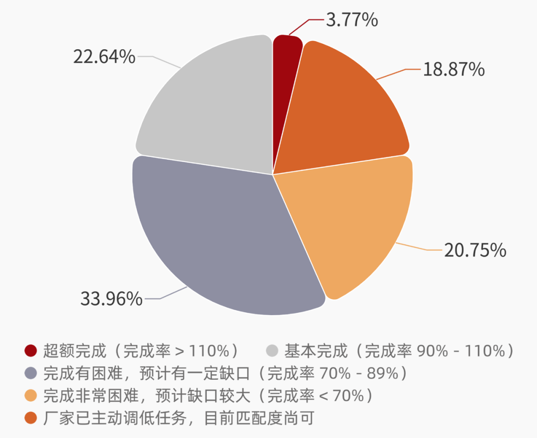 调研显示,2025年销售任务的完成情况中,仅26%的经销商表示能完成,34%的经销商坦言“完成有难度”,21%的经销商明确表示难以完成,且缺口较大,完成率低于70%。