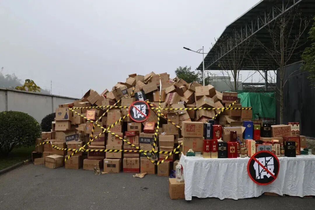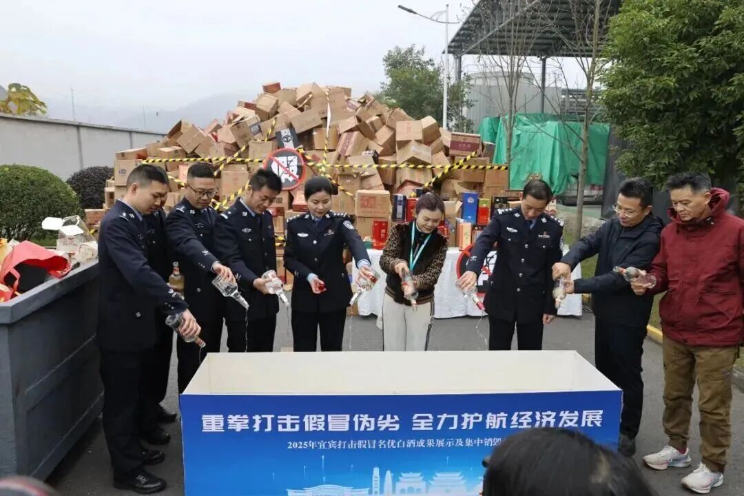 12月5日,宜宾公安组织开展“重拳打击假冒伪劣 全力护航经济发展”集中销毁活动。现场销毁假冒茅台、五粮液、泸州老窖等名优白酒17600瓶,各类包装材料8.6万余件(套),以及制假工具一批。被销毁的成品及半成品假酒按正品市场价计算,货值高达2000余万元,有力震慑了制售假酒犯罪活动,彰显了宜宾公安保护知识产权的坚定决心。