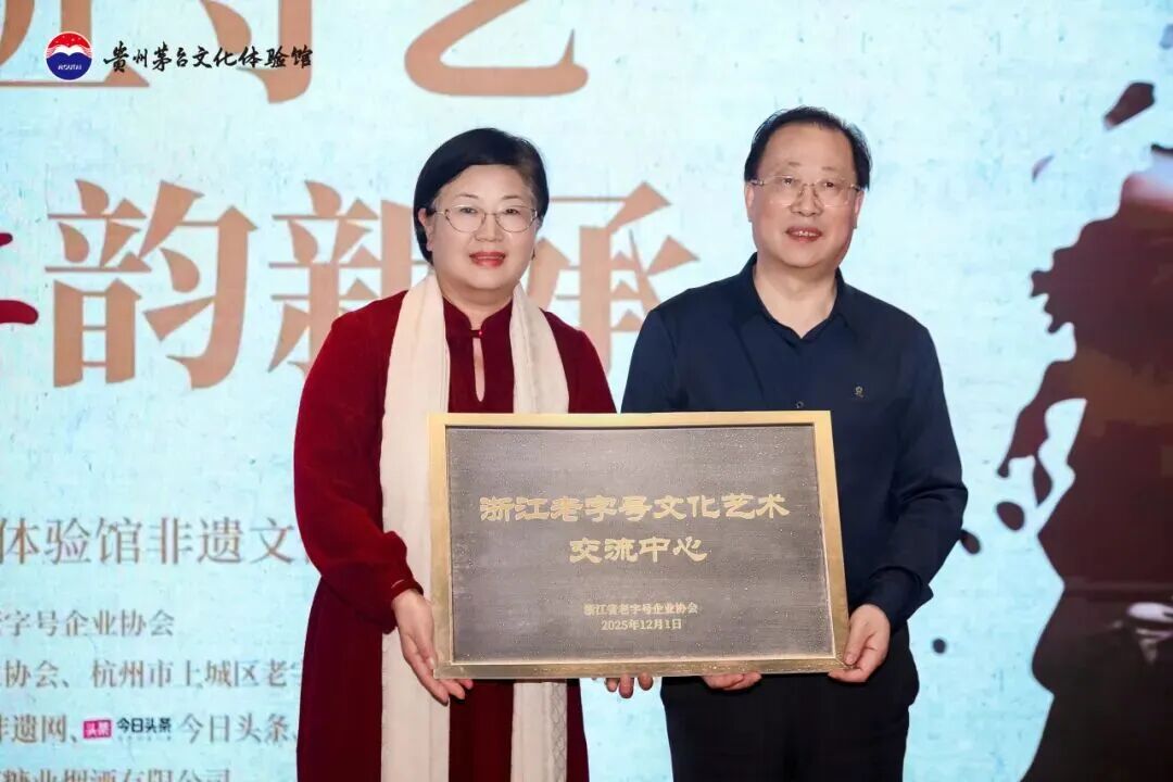 浙江省老字号企业协会执行会长丁慧敏向杭州华商糖业烟酒有限公司颁授浙江老字号文化艺术交流中心牌匾。